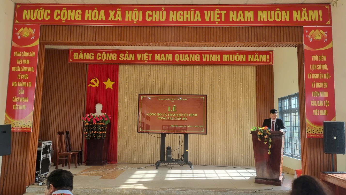 Sáng ngày 24/11/2025, Ban Thường vụ Đảng uỷ xã Đăk Môn đã tổ chức Lễ công bố và trao Quyết định về công tác cán bộ. Tham dự có đồng chí Y Thanh - Bí thư Đảng uỷ, Chủ tịch HĐND xã; đồng chí Plong Phan - Phó Bí thư Thường trực Đảng uỷ xã; đồng chí Nguyễn Văn Trà - Phó Bí thư, Chủ tịch UBND xã; các đồng chí trong Ban Thường vụ Đảng uỷ; đại diện lãnh đạo các cơ quan, đơn vị thuộc Đảng ủy, HĐND, UBND, UBMTTQVN xã.