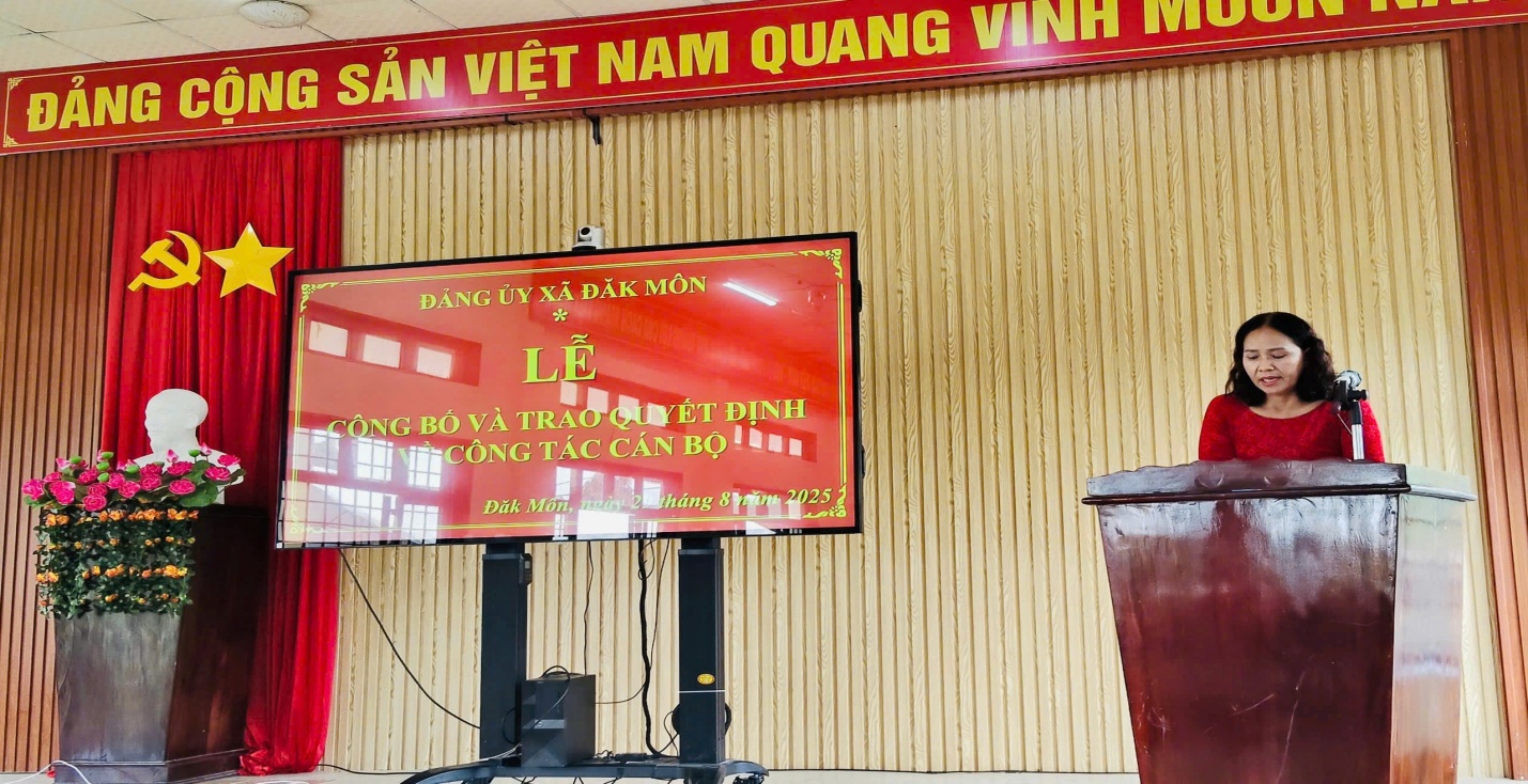 Sáng ngày 29-8-2025, Ban Thường vụ Đảng ủy xã Đăk Môn đã tổ chức Lễ công bố và trao quyết định về công tác cán bộ.