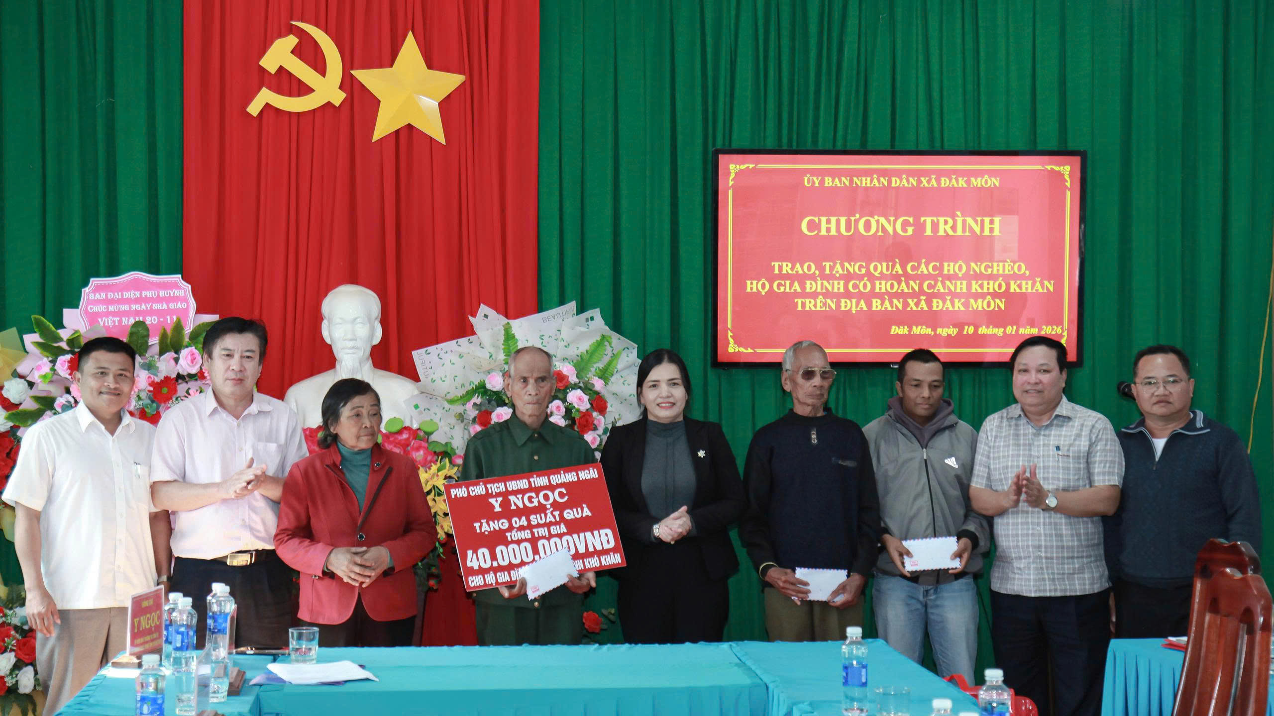 Đến dự và trực tiếp trao quà có đồng chí Y Ngọc – Ủy viên Ban Thường vụ Tỉnh ủy, Phó Chủ tịch UBND tỉnh Quảng Ngãi. Về phía địa phương có đồng chí Nguyễn Văn Trà – Phó Bí thư Đảng ủy, Chủ tịch UBND xã Đăk Môn, cùng đại diện các ban ngành, đoàn thể và các hộ gia đình được nhận quà.